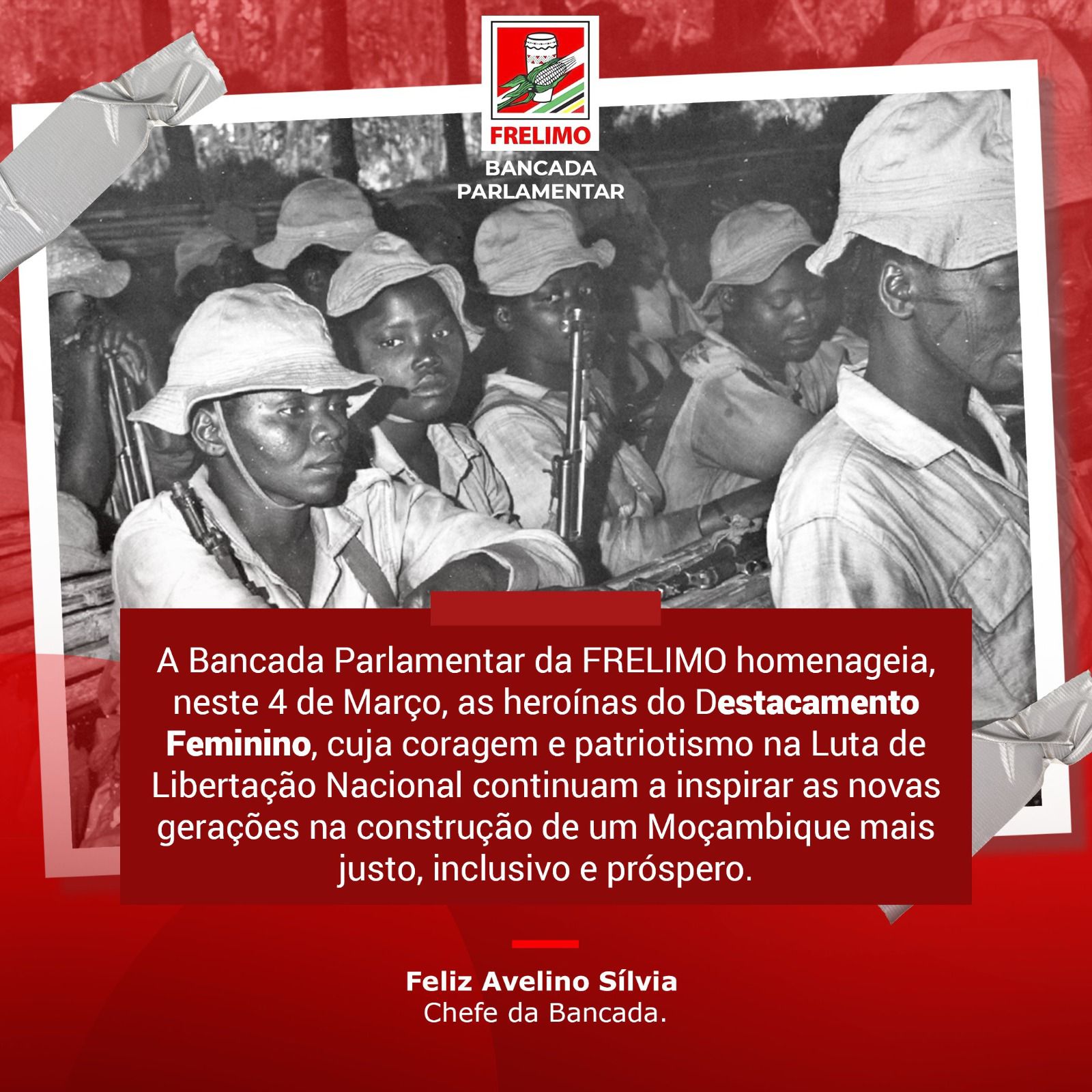 A Bancada Parlamentar da FRELIMO na Assembleia da República assinala, com profundo respeito, o Dia do Destacamento Feminino, uma data que eterniza a coragem das mulheres moçambicanas que, em 4 de Março de 1967, integraram as fileiras da Luta de Libertação Nacional para defender a liberdade e a dignidade do nosso povo.